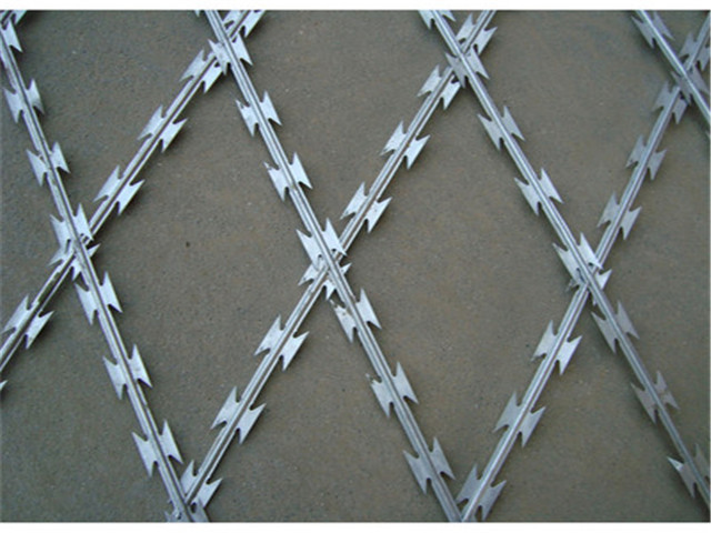 螺旋型交叉式刀片刺繩系在兩條刀片刺網之間以不銹鋼片和鍍鋅鋼片強力夾和,展開后即成交叉狀,取其美觀又實用。
