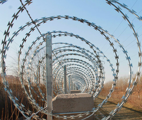 刺絲滾籠選用刀片刺繩繞圈后相鄰兩圈每隔120度用刺絲銜接卡固定,打開后構成蛇腹網狀,閉合后刀片刺繩卷徑為50cm,打開后每穿插圈裝置間隔20cm,直徑不小于45cm.假如是要求嚴厲的當地,這是最規范的規則。